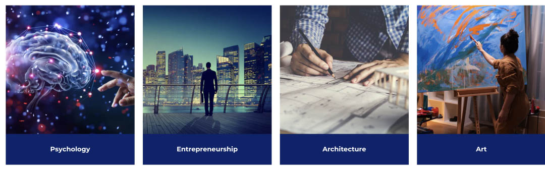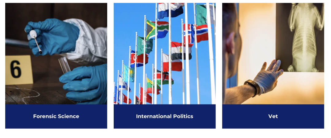 医药、投资银行、工程师、法律、心理学、企业家、建筑师、艺术、 电脑科学、牙医、时尚设计、电影、法医、国际政治、兽医