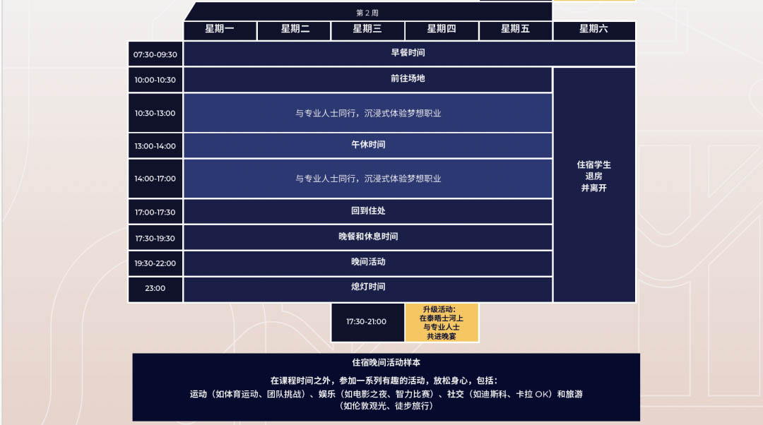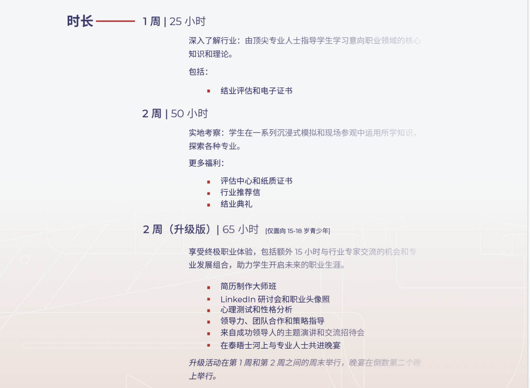 今年的项目比往年更好的是:项目分为一周或两周课程,同时推出高级版2周课程,包含了令人惊喜的升级版体验,包括:与行业内专业人士的私人社交晚宴、学生未来职业发展心理测试分析、linkedin 个人简历辅导和资料建设、特别团建活动、伦敦西区顶级音乐剧欣赏、业内人士出具的推荐信等。其中投资银行实践专业升级版的课程在伦敦政经学院LSE举行。